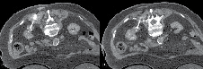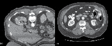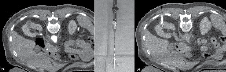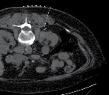 In an ideal case, there are three CT scans performed. The first CT scan is performed in the prone position using IV contrast (50% of standard dose) to plan the procedure. It is important to pay attention to surrounding structures as abdominal contents could have shifted compared to a supine CT scan. Patients with renal insufficiency can be challenging as contrast is usually avoided. Therefore, one must rely on cortical changes in the non-contrast phase to delineate the lesion, Figure 1. The trajectory of the probe is planned and measured. It is of high importance to be able to insert the probe as straight as possible (perpendicular to the skin) toward the mass. If a mass is quite medial as shown in Figure 1, it is best to plan the placement of the probe slightly lateral off the paraspinal muscles to avoid pain.