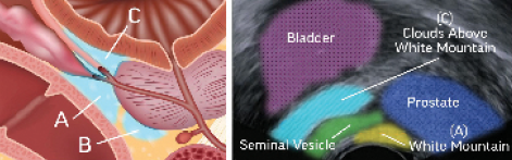 During our early commercial experience, we observed urologists using a modified peri-prostatic nerve block during Rezūm procedures that consistently provided patients with a comfortable treatment experience; modifications are attributed to J.R. Beahrs, MD. A traditional periprostatic block includes bilateral injections of a local anesthetic at the vascular pedicle, the junction between the base of the prostate and the seminal vesicles (sometimes referred to as the “White Mountain” as viewed on TRUS), and along the prostate to the apex. Table 1 presents pain management options used successfully for the Rezūm procedure; Figure 3 illustrates the periprostatic block. No single anesthesia protocol is considered standard. Some patients prefer to not have transurethral or transrectal prostate blocks while completely awake. For patients who prefer sedation, we often work with anesthesiologists to offer in-office or ambulatory surgery center sedation/total intravenous anesthesia with or without the modified prostate block.