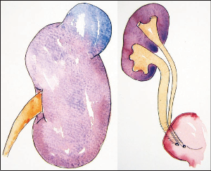 Simple, solitary renal cyst and ureteric duplication with reflux into lower pole. Images from “Congenital Anomalies of the Urinary Tract. Churchill Living- stone 1990. (Out of print).